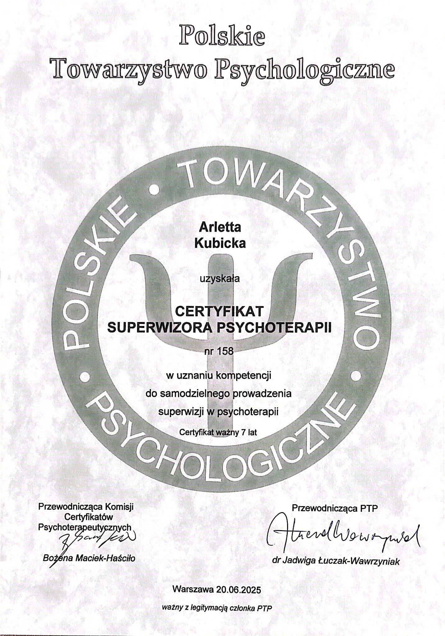 Zdałam egzaminy wymagane do certyfikatu psychoterapeutki i superwizorki psychoterapii w Polskim Towarzystwie Psychologicznym.